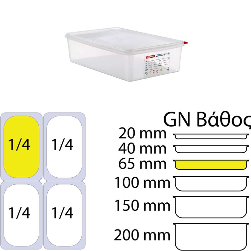 Αεροστεγές Δοχείο PP με καπάκι, Σειρά HERMETICA GN1/4, 1.8lt 265x162x65mm, ARAVEN