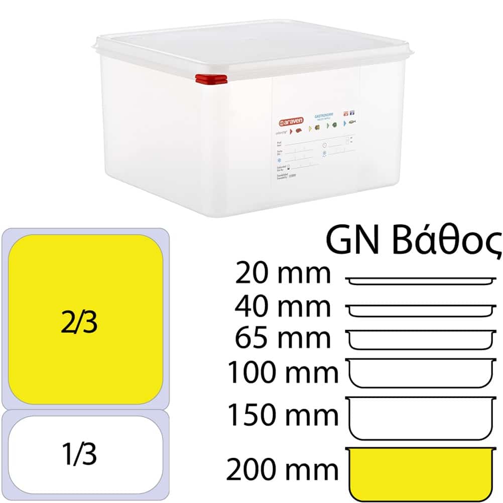 Αεροστεγές Δοχείο PP με καπάκι, Σειρά HERMETICA GN2/3, 19lt 354x325x200mm, ARAVEN