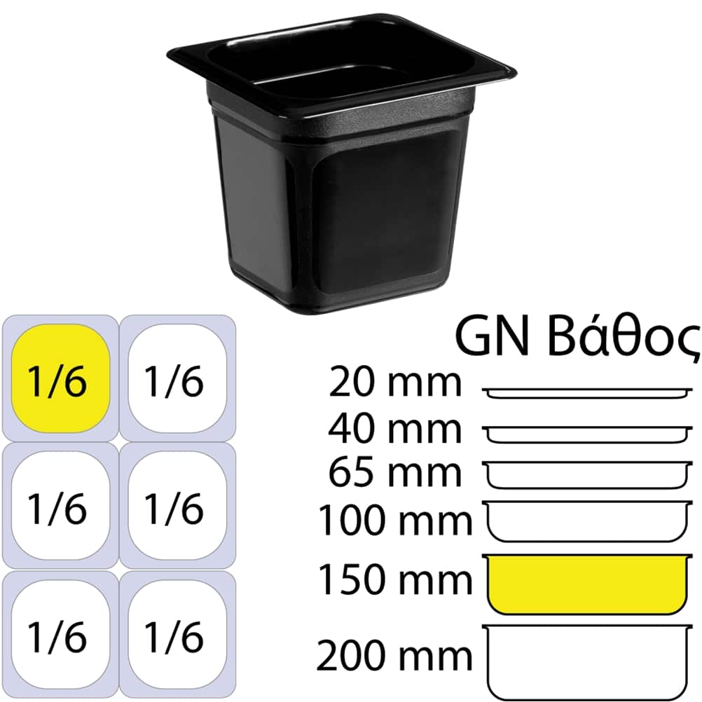 Δοχείο Τροφίμων Μαύρο PP, χωρίς καπάκι, GN1/6 (162 x 176mm) – ύψος 150mm (1,76Lt)