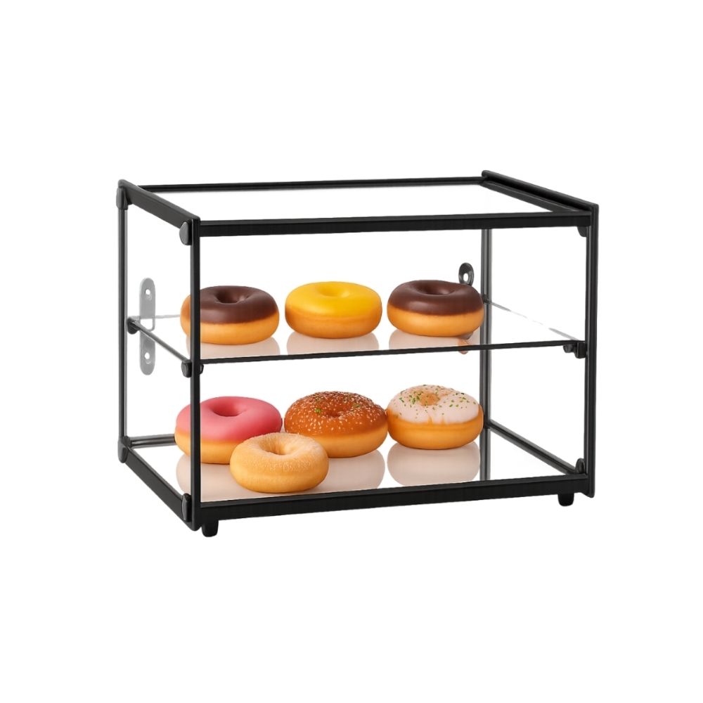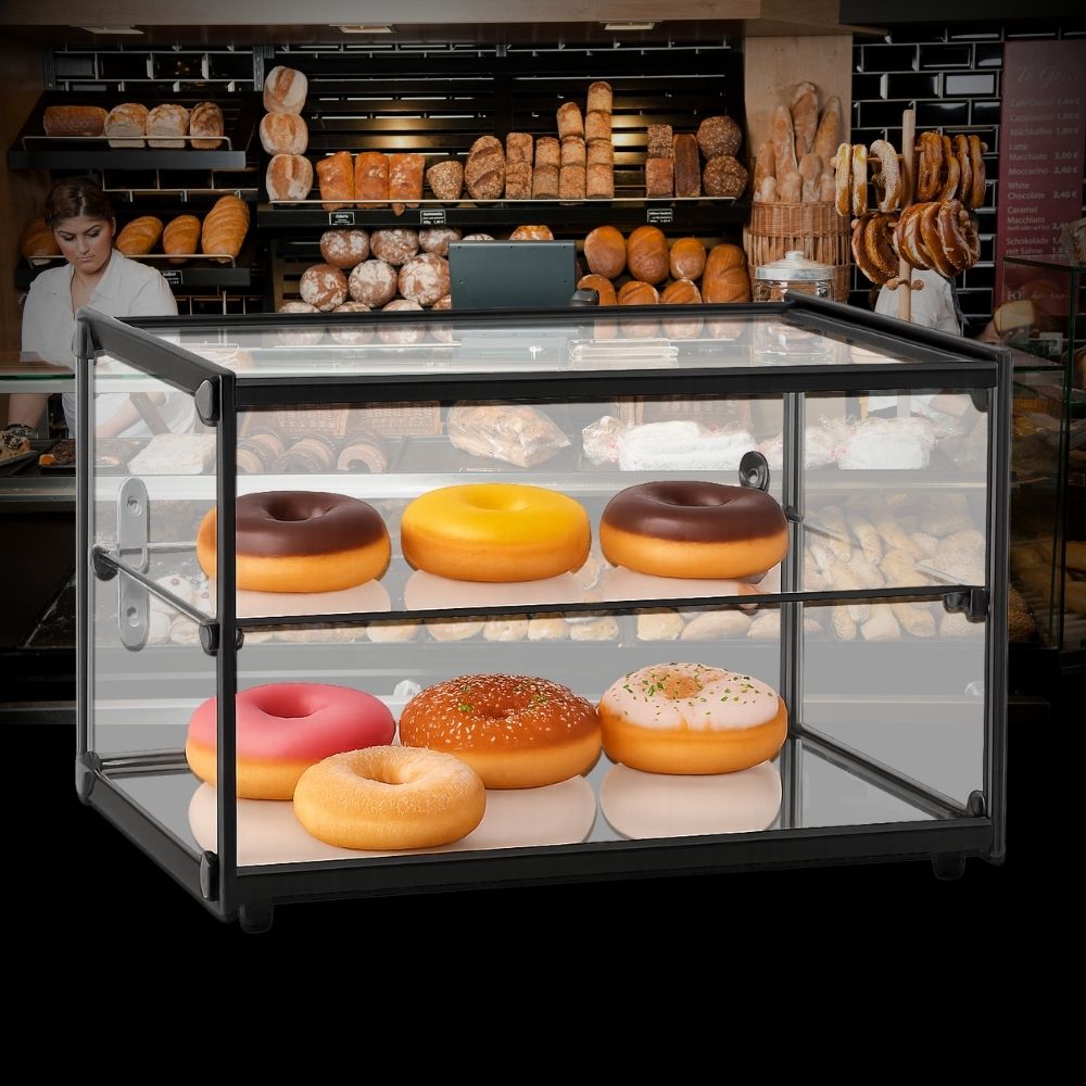 Βιτρίνα τροφίμων από ασφαλές γυαλί για ιδανική προβολή γλυκών, αρτοσκευασμάτων και σνακ σε επαγγελματικούς χώρους εστίασης.