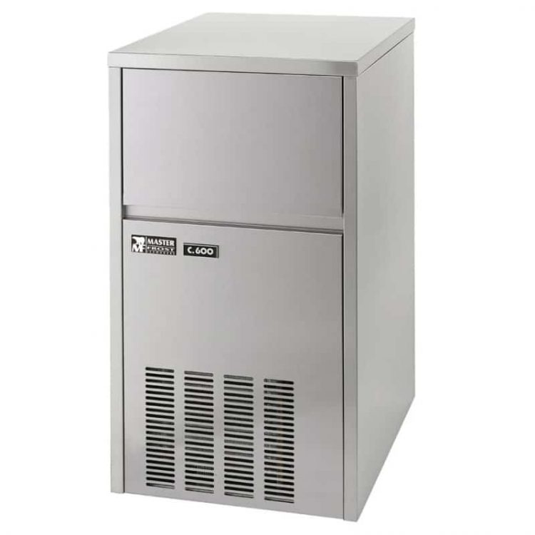 Παγομηχανή 60kg/24h C600 Masterfrost για παγάκι με τρύπα. Η μηχανή δεν χρησιμοποιεί by-pass για την αποκόλληση του πάγου αλλά ζεστό νερό το οποίο θερμαίνεται από τον συμπιεστή, με αποτέλεσμα την μεγαλύτερη διάρκειας ζωής συμπιεστή.