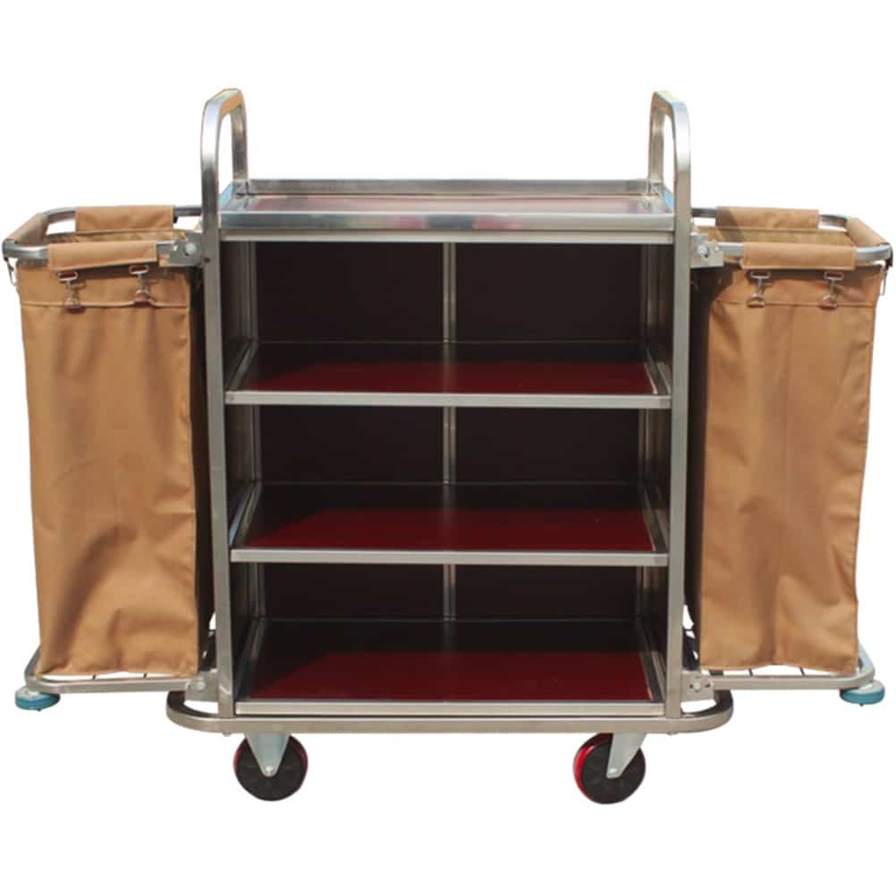 Τρόλεϊ καμαριέρας με 3 ράφια & 2 σάκους, INOX + ξύλο MDF