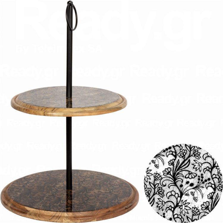 Ξύλινη τουρτιέρα 2 επιπέδων, φ30xΥ50cm, Ακακία σε απόχρωση καρυδιάς, με μαύρο τυπωμένο σχέδιο